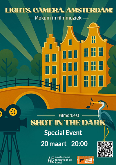 LIGHTS, CAMERA, AMSTERDAM! Amsterdam bestaat 750 jaar, en dat vieren we met muziek! Speciaal voor deze gelegenheid is het orkest van Shot in The Dark uitgebreid met strijkers. Ga met ons mee op een filmische en muzikale reis door onze hoofdstad. Denk aan James Bond in Diamonds Are Forever, Baantjer in de oude binnenstad, en de Amsterdamse volksheldin Bleeke Bet, met natuurlijk een hoofdrol voor de Westertoren. Een avond vol filmklassiekers en een muzikale ode aan het mooie Amsterdam. Mis het niet!